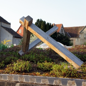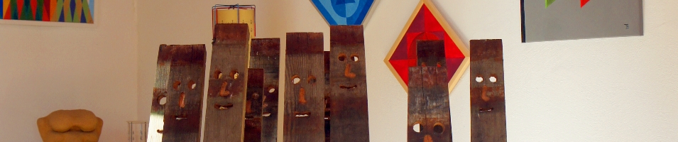 "Empfangskomitee" – Als aktiver Mensch versuche ich Einflüsse und Strömungen in mein Handeln einzubeziehen. In der Öffentlichkeit wurde und wird intensiv über die Willkommenskultur in Deutschland debattiert. Dieser Willkommensgedanke und die Partnerschaft mit Garons haben mich inspiriert, die schon länger als „Begrüßer" eingesetzten Faßdauben in einem Objekt zu vereinen, um als „Empfangskomitee" die Offenheit und Freundlichkeit von Flörsheim-Dalsheim zu symbolisieren. Die drei Fassdauben haben sich zu einer Dreiergruppe zusammengefunden und stehen seit dem 25. März 2015 auf der Grünfläche gegenüber des Bahnhofs als das „Empfangskomitee" bereit, um mit ihren am oberen Ende eingefrässten, lachenden Gesichtern stellvertretend für die Flörsheim-Dalsheimer, unsere Partnergemeinde Garons und alle vorbeikommenden Besucher mit heiterer Offenheit zu grüßen.